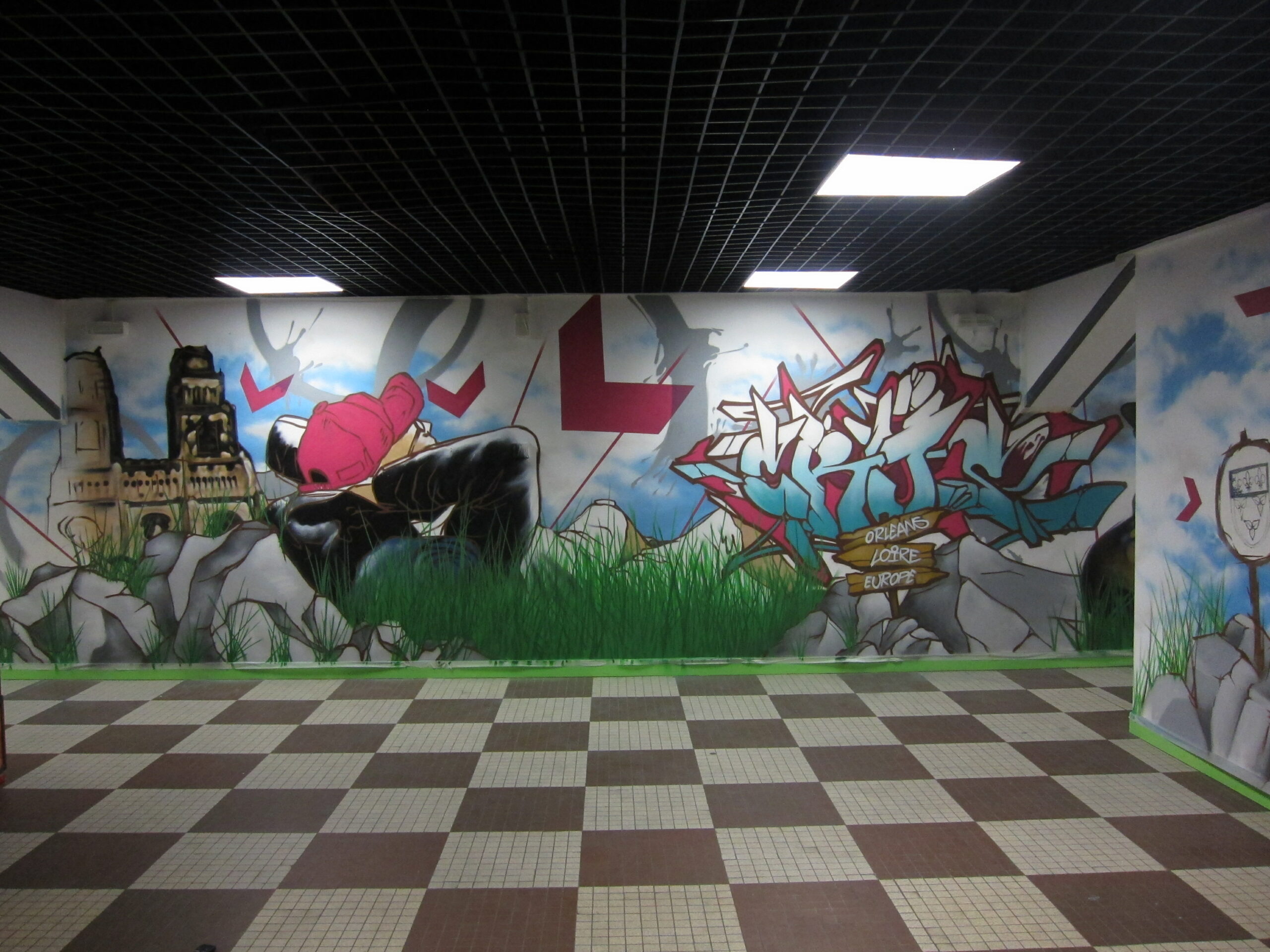 Réalisation à l’aérosol fluorescent pour lumière noire au bowling d’Olivet, à Olivet (45160) en 2021.